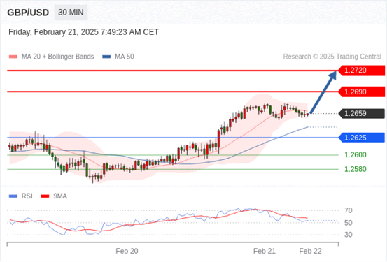 在 1.2625 之上,看涨,目标价位为 1.2690 ,然后为 1.2720 。