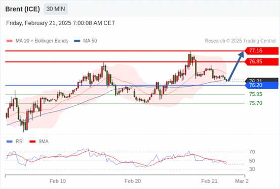 在 76.20 之上,看涨,目标价位为 76.85 ,然后为 77.15 。