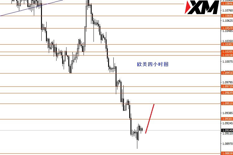 欧元周初继续下行,昨日收小阳柱。从图形来看,汇价已接近前期低点1.0880区域,下方支撑较强,短线需要修正。今日短线操作建议:1.0910区域做多,止损1.0880,目标看向先1.0950/1.0960区域。控制仓量,严格止损。
