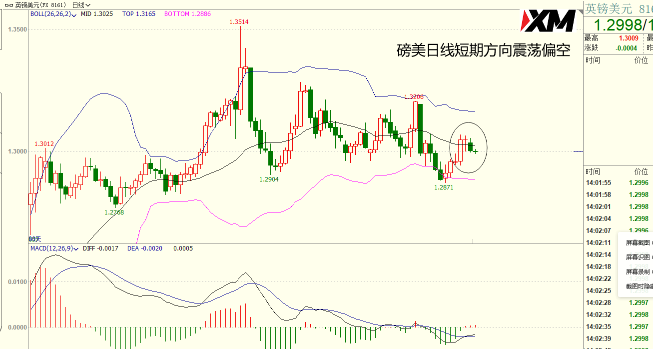 磅美日线目前布林带收敛缩口,属于极度震荡的状态,目前价格在中轨下方运行,震荡偏空。