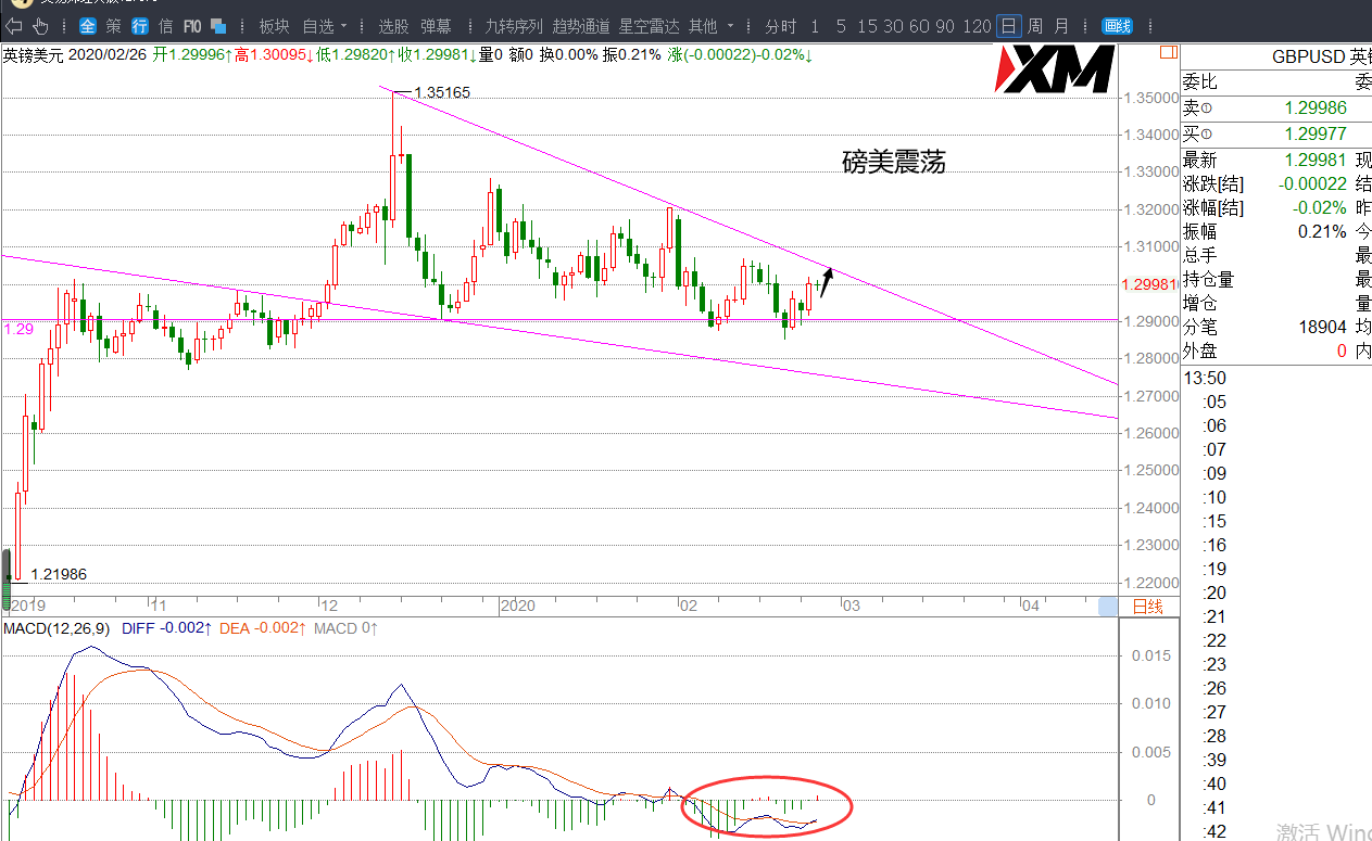 磅美日线MACD能量震荡收敛,昨日K线呈上涨,今日看震荡偏多,关注回调短多机会。