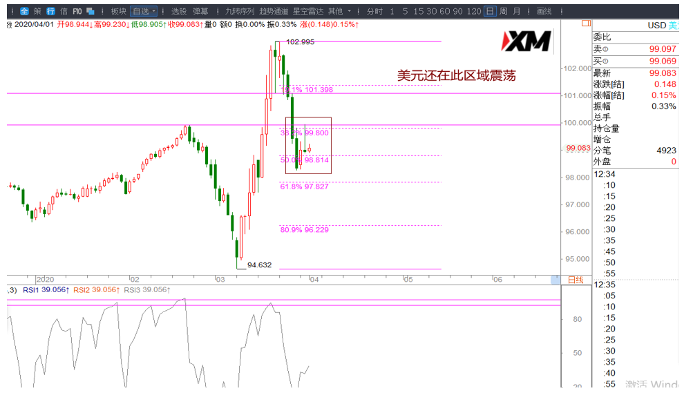 美元在日线价格98.88上方维持昨日震荡走势,上涨继续关注99.80一带是否被突破。