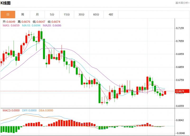 周三盘中,澳元美元报0.6674,涨幅0.33%。