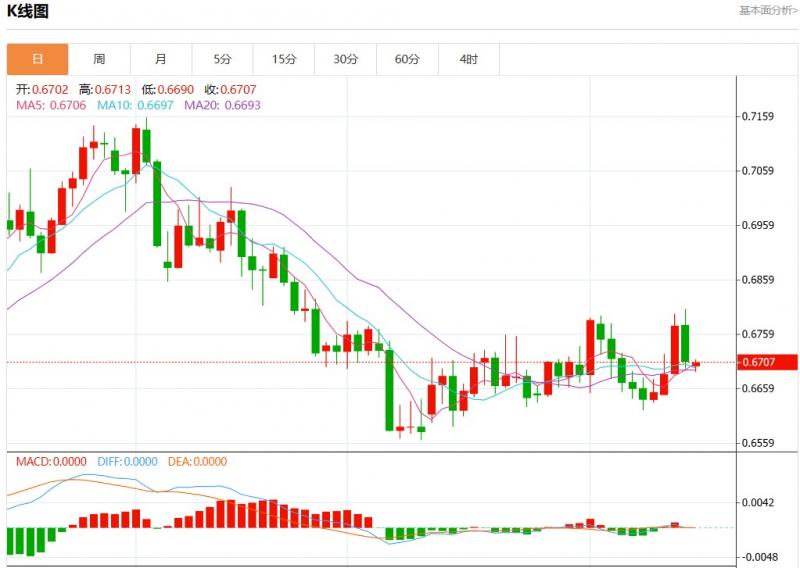 周一盘中,澳元美元报0.6708,跌幅0.03%。