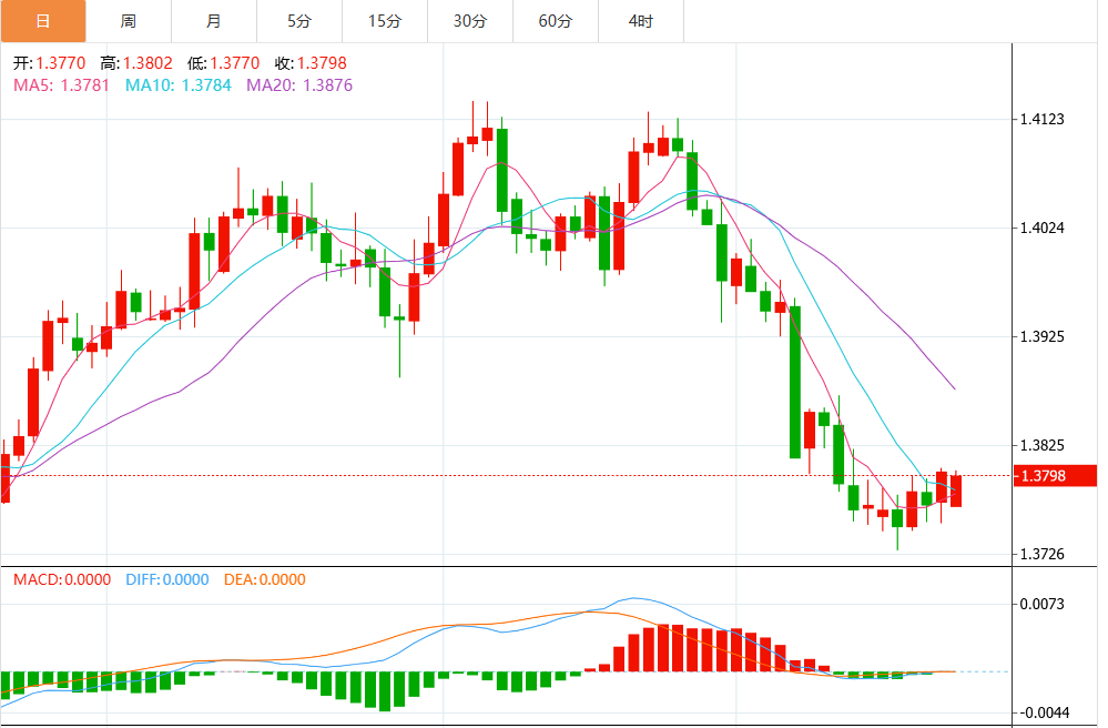 从图表来看,USD/CAD短期技术结构显示出明显的低位整理特征。汇价在1.3780附近反复震荡,多空力量暂时均衡,未出现趋势性突破。下方支撑位集中在1.3760区域,这一区域为近期盘整下沿,如果有效跌破,可能会测试1.3720附近的次级支撑。