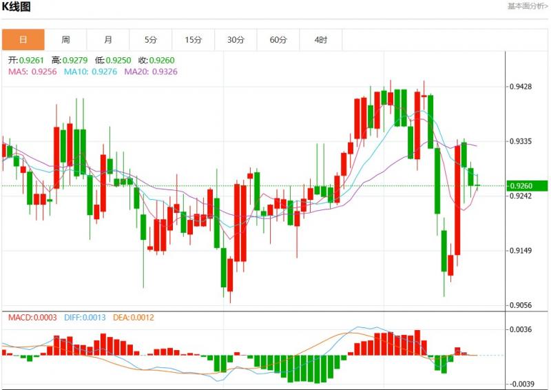 周一盘中,美元瑞郎报0.9254,跌幅0.01%。