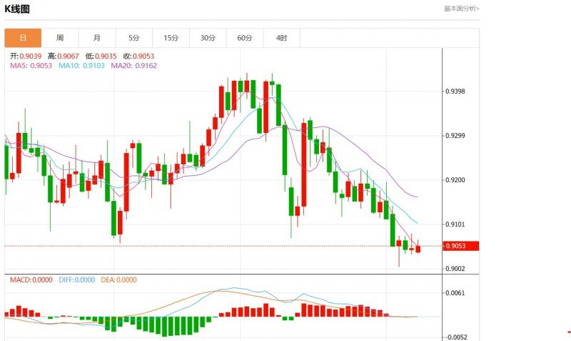 周一盘中,美元瑞郎报0.9052,涨幅0.05%。