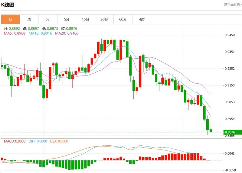周五盘中,美元瑞郎报0.8877,跌幅0.14%。
