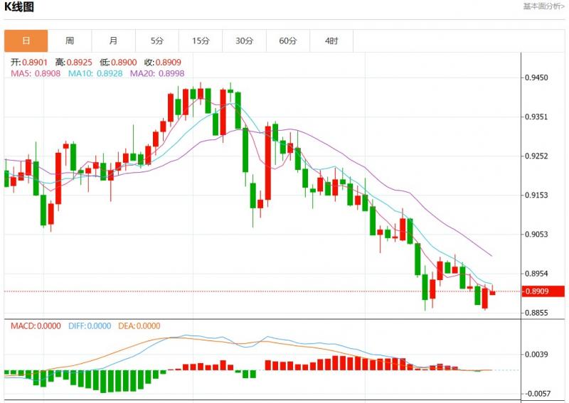 周三盘中,美元瑞郎报0.8909,跌幅0.08%。