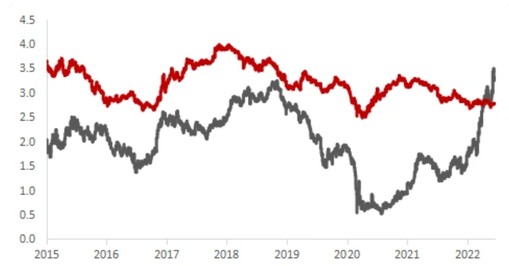 美联储加快收紧货币政策,美元指数快速走高、一度升至105以上,美债收益率也大幅攀升,导致中美利差收窄甚至倒挂,放大了人民币汇率调整压力。截至6月21日,中美10年期国债收益率利差倒挂达到52个基点,美元指数升至104.4,年内升值幅度接近9%。