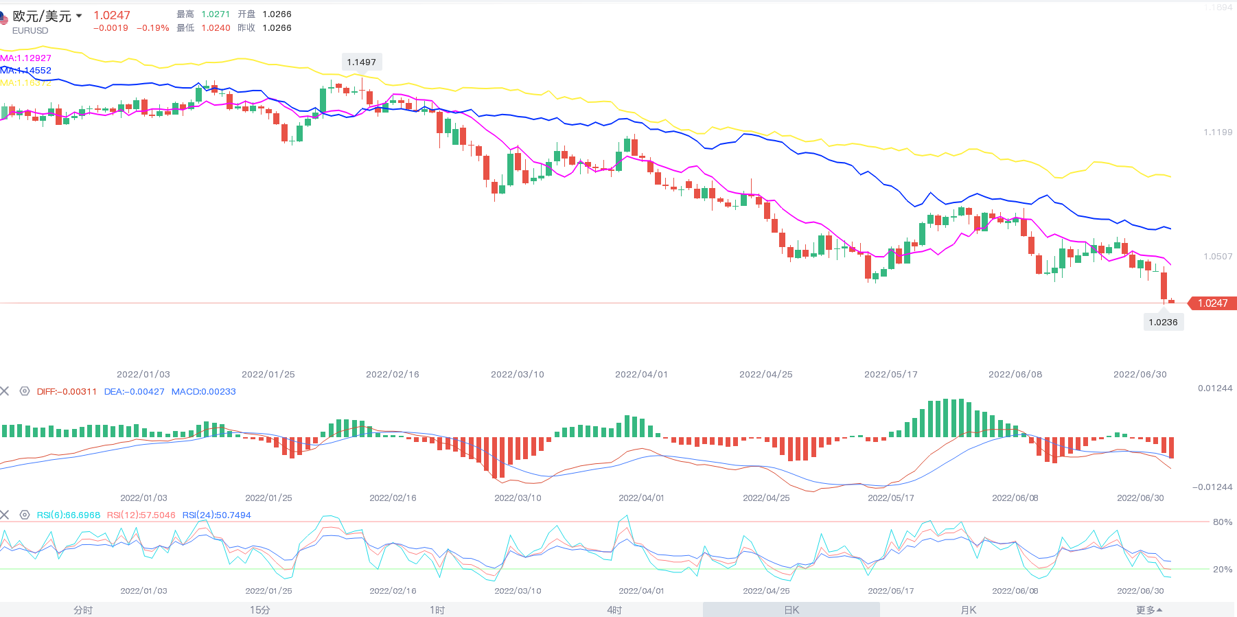 欧元/美元在2022年初在1.14附近短暂震荡之后便因美联储加息提前的预期而有所下行。2月下旬伴随7俄乌局势恶化,欧元跌破1.11附近关键支撑并下测1.08附近。进入4月以来,在美欧货币政策分化预期和俄乌局势反复所带来的避险情绪推动下,欧元继续走低并跌破1.08关键支撑。欧元的跌势持续到了5月上旬,最低点保持在1.0350附近。5月中下旬,在ECB官员们进一步释放鹰派信号以及市场对美联储加息预期维持稳定的背景下,货币政策分化逻辑有所转向,欧元也出现触底反弹迹象,一度站上了1.07。6月欧元/美元整体走低,跌逾2%,6月收报1.0481。