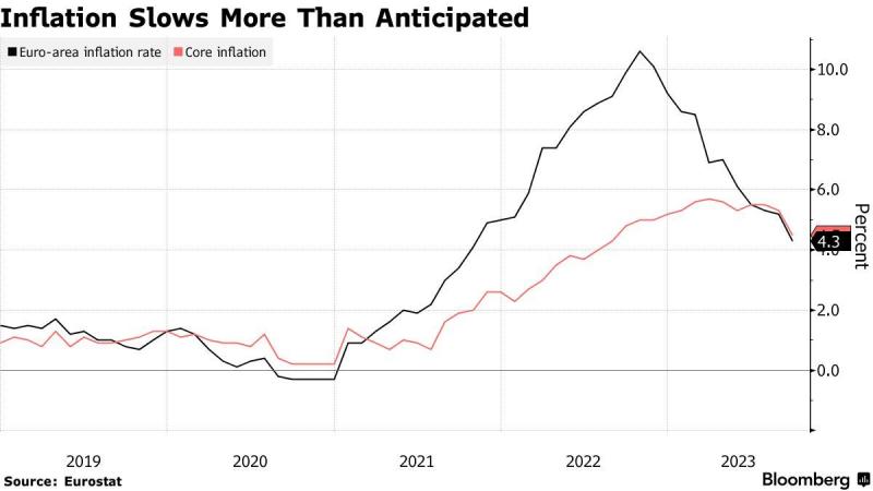 欧元区核心通胀率降至一年来最低水平,这支持了市场对欧洲央行将维持利率不变、以评估其前所未有的加息行动的影响的预期。欧盟统计局周五公布的数据显示,欧元区9月剔除食品能源烟酒的调和CPI同比涨幅为4.5%,低于前值5.3%和市场预期的4.8%。