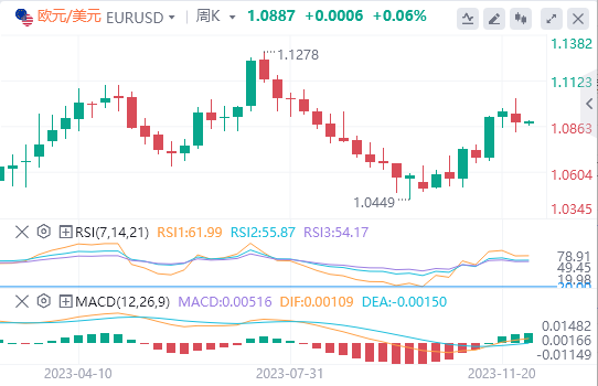 11月整体呈现上升趋势,接近1.10的水平,11月,欧元区的CPI初值同比上升了2.4%,低于预期的2.7%,相比于两个月前的4%-5%,降幅明显。尤其是能源价格下降(同比下降11.5%)是通胀下降的主要原因,虽然服务业等核心通胀仍维持在4%左右。与此同时,德国的失业率在11月意外上升至5.9%,达到近两年半的新高。同时,法国的第三季度GDP终值被下修,环比增速由增长0.1%调整为萎缩0.1%,同比增速也从0.7%下调至0.6%。此外,法国10月的投资和家庭消费数据也低于预期。市场对欧洲央行可能提前降息的预期增强。预计欧洲央行将在2024年4月降息25个基点,降息提前至3月的概率达到50%。截至发稿,欧元/美元徘徊在1.0877附近。