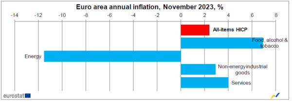根据欧盟统计局的估计,2023年11月欧元区的年通货膨胀率预计为2.4%,低于10月的2.9%。