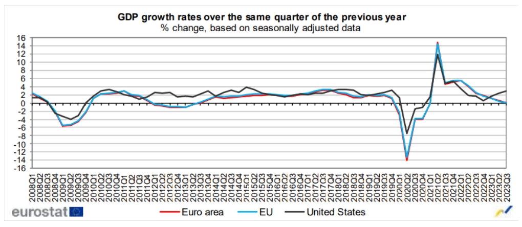 与上年同期相比,2023年第三季度欧元区和欧盟经季调国内生产总值均增长了0.1%,而上一季度欧元区和欧盟国内生产总值分别增长了0.5%和0.4%。