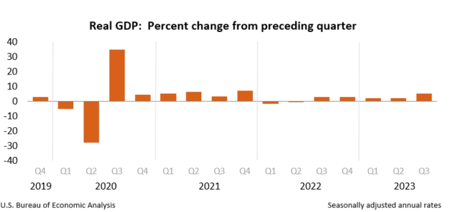 美国经济分析局数据显示,2023年第三季度,美国实际国内生产总值增长年率为4.9%。第二季度,实际国内生产总值2.1%。第三季度经济增长主要反映了消费支出和库存投资的增长。