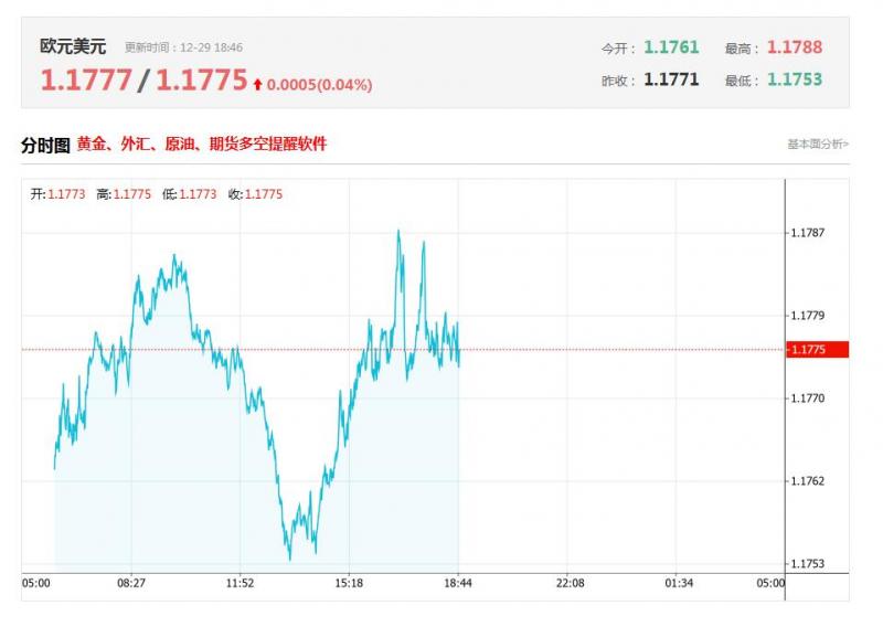 欧元兑美元今日汇率最高1.1777 ,最低1.1775 ,涨跌0.0005 ,涨跌幅0.04% 。