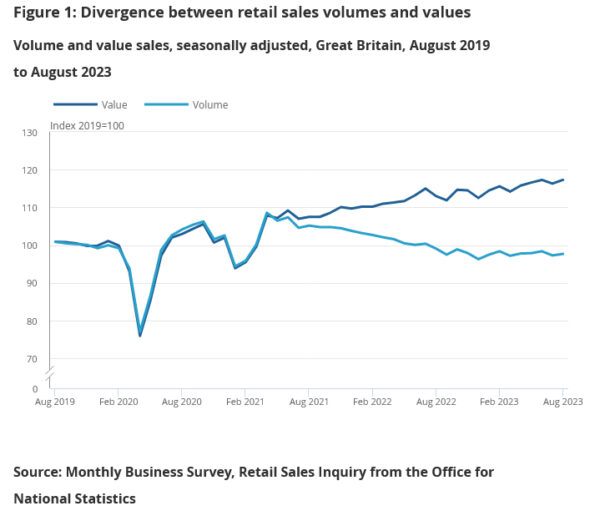 退一步分析更广泛的时间框架,截至2023年8月的三个月期间,销售额比前三个月增长了0.3%。不包括汽车销售的销量也出现了0.3%的同样增长。就价值而言,增长更为明显,增长了1.3%,不包括燃料销售的价值增长更为强劲,达到2.0%。