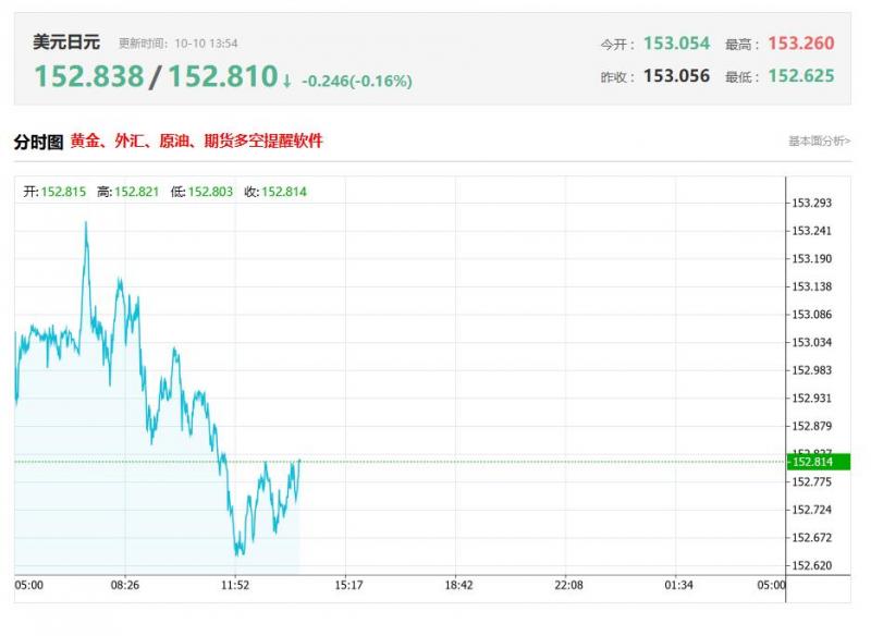 美元兑日元今日汇率最高152.838 ,最低152.810,涨跌-0.246 ,涨跌幅-0.16% 。