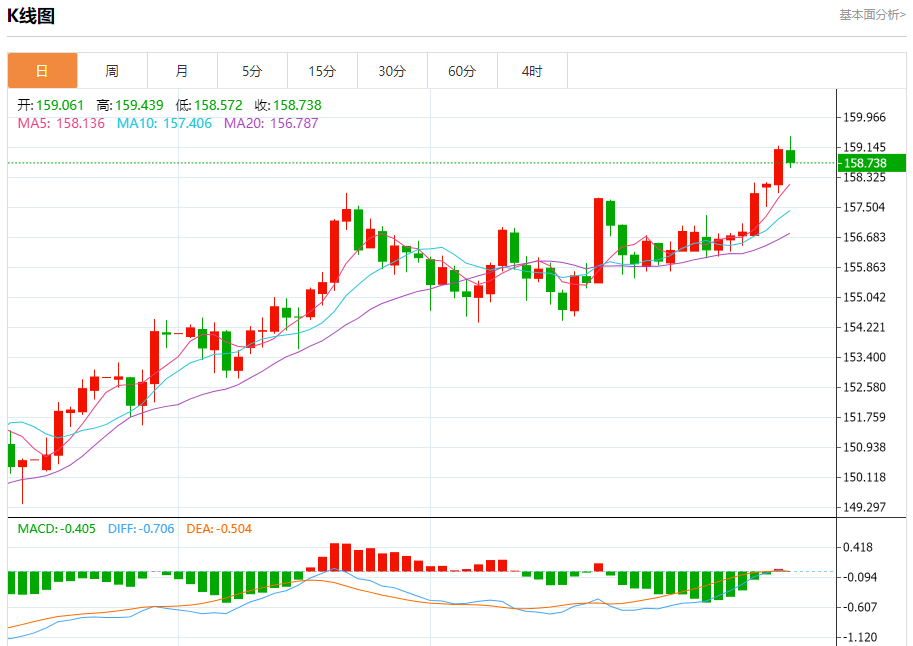 今日周三,截止目前美元兑日元报158.787,下跌0.21%。
