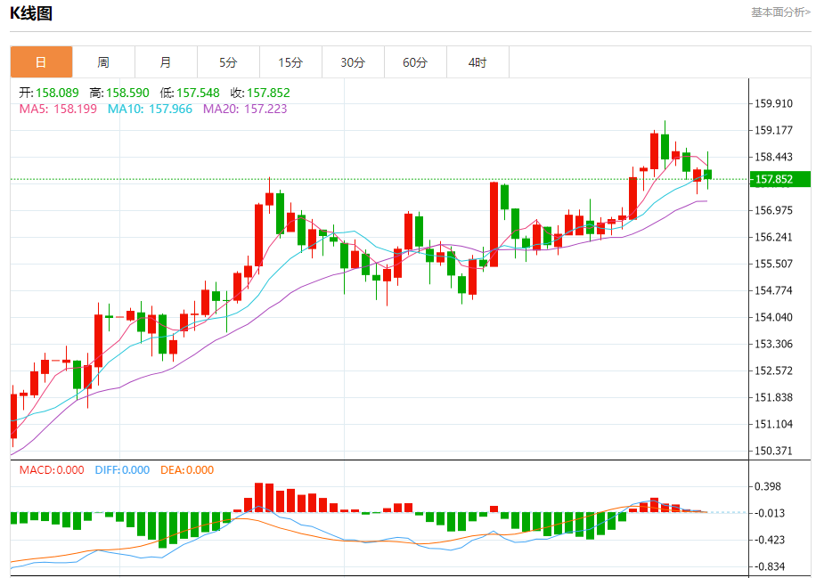 周二纽盘,美元兑日元交投于157.882,跌幅为0.15%。