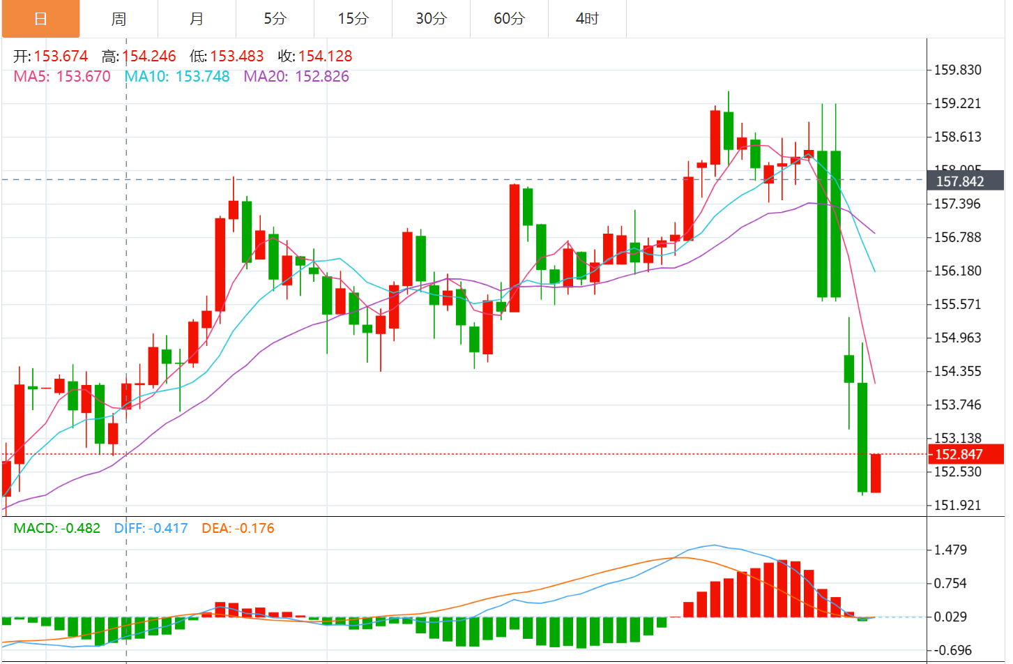 技术上,相对强弱指数(RSI)显示为30.94(超卖),可能出现暂停或修正反弹。从140.12低点测至159.19高点,38.2%回撤151.91提供初步支撑,若跌破则延续下滑。