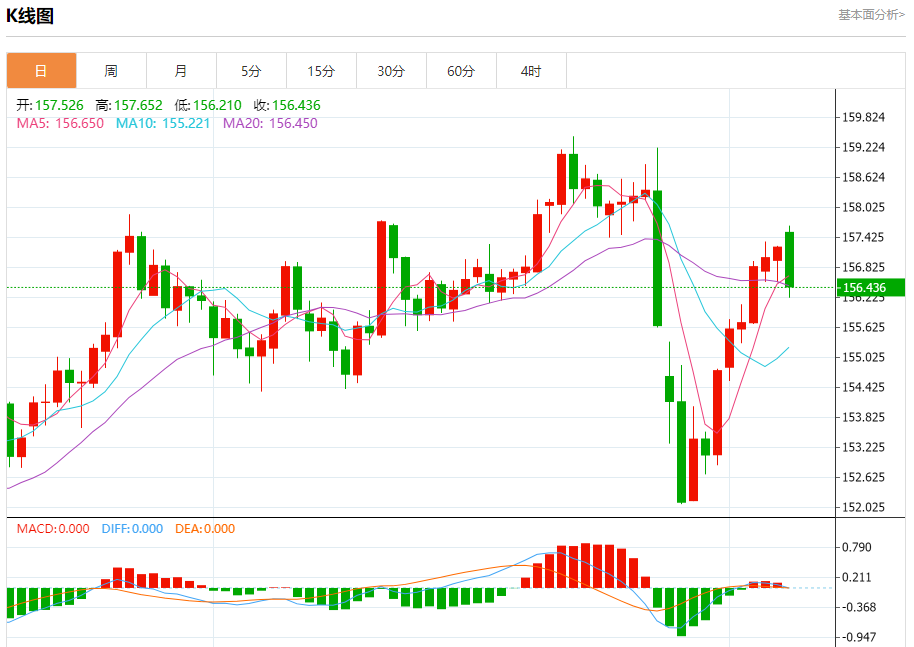今日周一,截止目前美元兑日元报156.441,下跌0.50%。