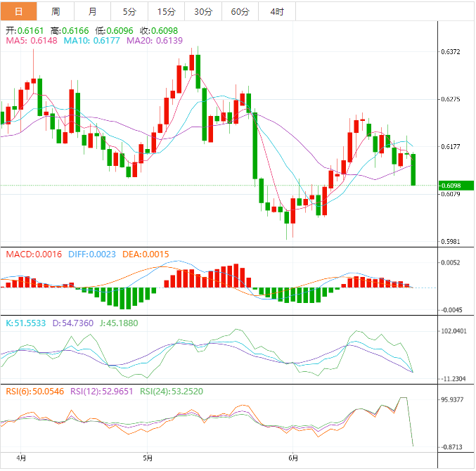 基本面上,纽元/美元在欧市早盘录得两周新低0.6113。由于需求黯淡且出口疲弱,中国经济前景恶化,预计该货币对进一步下跌。中国国家统计局报告称,由于家庭需求疲软,5月份企业利润下降了12.6%,高于4月份18.2%的下跌。值得注意的是,新西兰是中国的主要贸易伙伴之一,中国的经济前景疲软将对新西兰元施加压力。尽管周二股市收盘看涨,但标普500指数期货显示出谨慎态度。投资者在美联储主席鲍威尔发表讲话之前变得避险,以评估利率政策的指引。