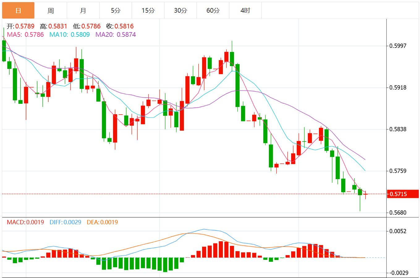 在下行方面,第一个关键支撑位将是10月14日的低点0.5682——六个月低点——,随后是年度低点0.5485。