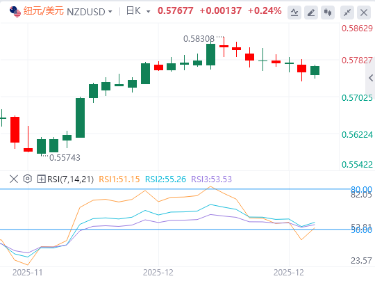 如果能持续守住20日均线,将保持反弹势头。如果价格突破12月11日高点0.5832,进一步上涨的路径将打开。而如果跌破周五的低点0.5735,价格可能会下跌。