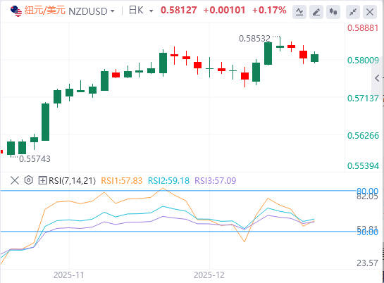 直接支撑位于0.5790区域,趋势线支撑与周一低点相接。进一步下跌,12月19日的低点0.5735将成为焦点,紧随11月至12月反弹的61.8%斐波那契回撤和11月中旬0.5690高点之前。