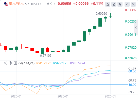 纽元/美元汇对可能目标为16个月高点0.6121,该高点于2025年7月记录,随后是上升通道约0.6150的上界。若突破该汇合阻力区,将暴露出0.6200的心理阻力位作为障碍。