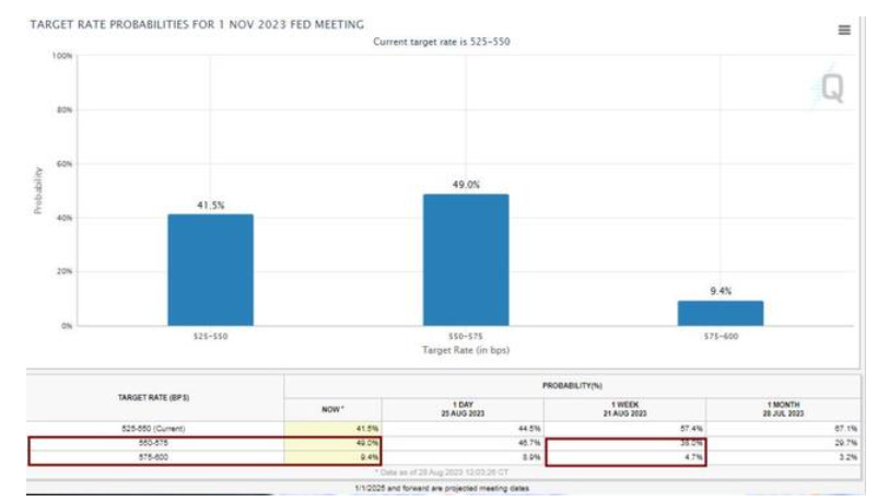 货币市场显示,交易员相信美联储今年将再次加息,这将使联邦基金利率目标区间从目前的5.25%-5.50%升至5.50%-5.75%。就在三个月前,市场还押注美联储今年至少会降息一次。分析师认为,鲍威尔在杰克逊霍尔的讲话总体上传达的新信息非常有限,市场已经提前对大部分结果做出了预判和反应。虽然9月美联储的加息可能性较小,但其发言为11月的加息留出了一定余地。目前市场预期11月加息的可能性为62%,讲话前也已经被充分定价。