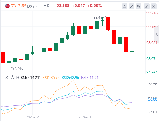 日线图本周显示出明显下行趋势,继上周未能突破99.072至99.384的主要回撤区后。该指数也处于上升趋势线的弱点,进一步加剧了看跌的基调。如果下行动能足够强烈,我们预计卖方将挑战98.307至97.814的回撤区间。这将使该指数有望突破12月24日的97.749主底。