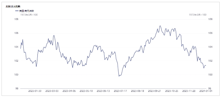 2023年12月29日,美元指数于当年最后一个交易日的纽约时段尾盘收于101.38,全年下跌2.11%。年内美元指数最高触及107.35。