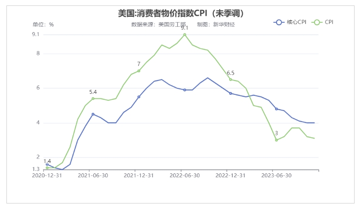 进入2023年下半年,随着通胀指标下降,美联储结束加息。2023年12月13日,美联储结束2023年最后一次货币政策会议后宣布将联邦基金利率目标区间维持在5.25%至5.5%之间不变,这是自2023年9月以来连续三次维持利率水平不变,基本为本轮激进加息周期画上句号。美联储主席鲍威尔表示,联邦基金利率“可能已经或接近本轮紧缩周期的峰值”,与会官员普遍认为“进一步加息不太可能是合适的”。不过,为了抑制市场的激进降息预期,鲍威尔仍为政策变化留了“活话”,称美联储仍准备在适当情况下进一步收紧政策并保持政策的限制性水平,直至确信已达成通胀目标。