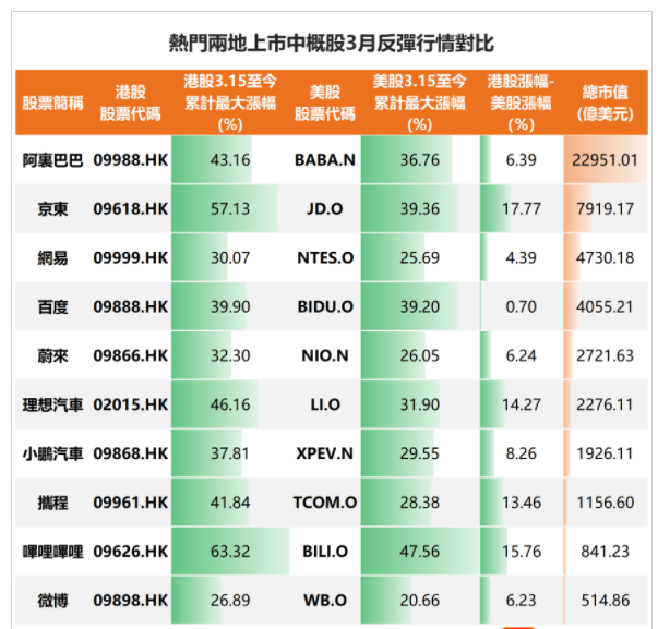 北京时间3月18日晚间,中美两国元首视频通话,中概股美股延续大涨势头。 港美股中概股的3月行情如同坐过山车,着实令投资者惊心动魄。 自3月15日中概股反弹行情启动以来,B站港股累计最大涨幅超63%,京东累计最大涨幅超57%,理想汽车累计最大涨幅超46%,阿里巴巴累计最大涨幅超43%;同时期中概美股也经历大涨行情,但