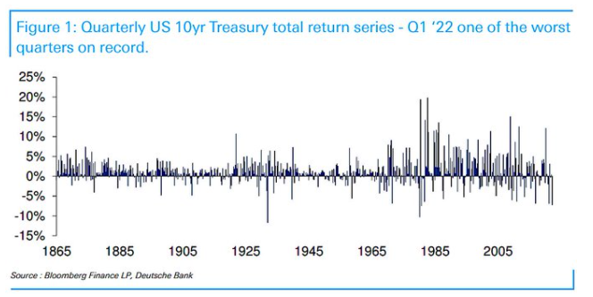随着市场今日步入3月的最后一个交易日,一季度的行情即将正式落下帷幕。在这短短90多天的时间里,全球债市遭遇的“血洗”几乎令所有华尔街交易员都印象深刻,而其中,有着“全球资产定价之锚”之称的10年期美债,无疑也难逃此劫——一项统计显示,10年期美债料将录得过去157年来总回报最差的季度表现之一。 根据德意志