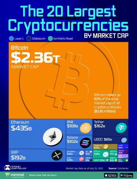 【全球市值排名前20的加密货币一览】根据CoinGcko的数据,下图列出截至2025年7月25日市值排名前20位的加密货币。其中,比特币的市值高达2.36万亿美元,占所有加密货币市值总和(3.81万亿美元)的62%,约为排名第二的以太坊(4350亿美元)的五倍多。Tthr和UDCoin是两种最著名的稳定币,继续在加密生态系统中发挥着至关重要的