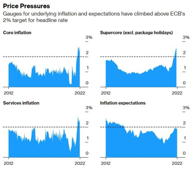 欧元区通胀连续四个月创历史新高,短期之内恐怕难以受控。如今,通胀范围甚至还有蔓延的趋势。数据显示,在剔除波动较大的能源、食品、酒类和烟草价格后,欧元区的核心通胀率从1月的2.3%上升至2月的2.7%。
