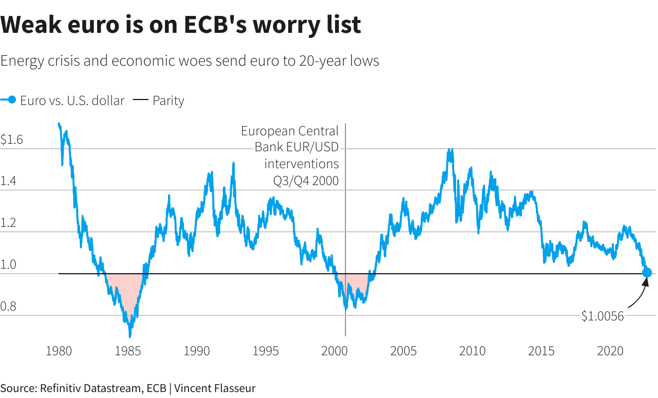 货币疲软使进口更加昂贵,这为更激进的加息提供了动力。欧元今年回落于1美元以下,下跌了12%。以一篮子货币的贸易加权计算,欧元已从6月份的水平下跌了近3%。