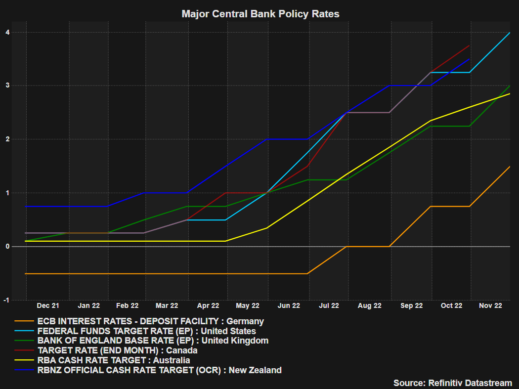 如果员工和企业设想通胀会持续更长时间,工人将游说提高工资,企业将把更高的运营和投入成本转嫁给消费者,这可能成为“工资价格螺旋”。新西兰联储已经预计来年工资增长5.34%,略高于未来一年的预期,并可能对降低总体物价水平构成挑战。下图显示,如果加息75个基点(4.25%),新西兰将领先于其他发达国家。