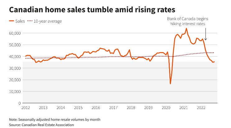 此外,对利率更敏感的经济部门显示出累积加息影响的迹象。卖家一直在推迟在市场上挂牌,希望房价能够出现春季反弹,而首次购房者发现更难获得资格和服务抵押贷款还款。下图显示了房屋销售的急剧下降,已降至10年平均水平以下。然而,实际房价仍然很高,但略有降温。