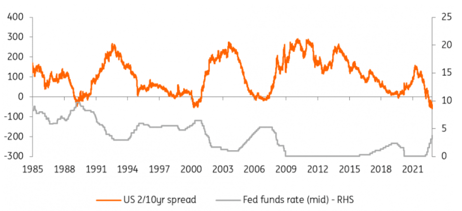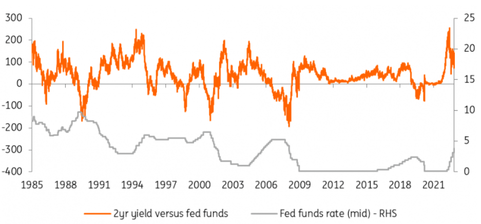 那么曲线呢?主要的主题是反反转,最终曲线变陡。目前看到的50bp反转应该首先从前端展开。当美联储达到5%的峰值时,2年期收益率应该从4.5%区域移动,迅速计入未来几年较低的联邦基金利率。