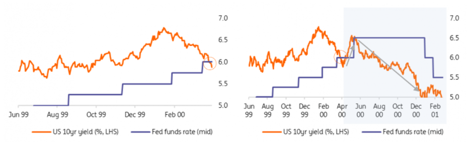 即使美联储一本正经地表示不会考虑降息,但历史表明,一旦美联储达到峰值,我们通常距离降息不到半年。互联网泡沫破裂提供了一个例子,说明一旦达到峰值,市场利率将如何跌破基金利率,随后美联储将下调基金利率。