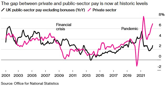 英国政府为公共部门员工提供了平均5%的加薪,并坚持认为需要限制工资以修复公共财政和抑制通胀。英国财政大臣亨特周二在一份声明中表示:“任何可能将高通胀嵌入我们经济的行动只会延长每个人的痛苦,并阻碍任何长期经济增长的前景。”