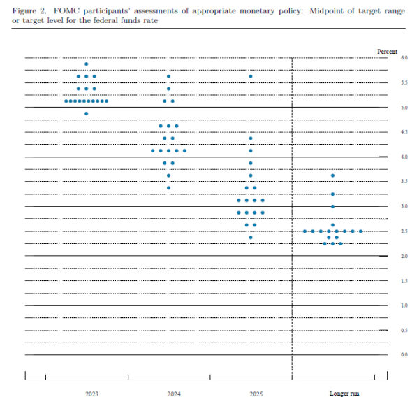2023年,10名委员会成员中的大多数人预计利率为5.00-5.25%,只有一人预计利率会更低。