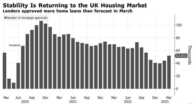 在英国,令人惊讶的是房地产市场的上涨。经济学家此前预计,在抵押贷款利率大幅上升后,英国今年房地产价格将下跌10%。相反,英国央行数据显示,3月新批准贷款数量从2月的4.41万笔增至5.2万笔,为五个月高位。