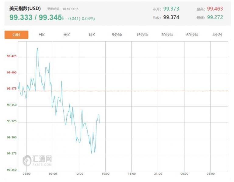 周五(10月10日)亚洲交易时段,美元小幅走跌,最新美元指数报99.345,跌幅0.04%,昨日美盘时段美元指数攀升至8月以来最高水平,美联储会议纪要进一步巩固了美元的强势地位。