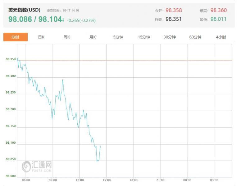 周五(10月17日)亚洲时段,美元延续疲软态势走低,最新美元指数报98.104,跌幅0.27%,日内可关注美国9月新屋开工总数年化(万户)、美国9月营建许可总数(万户)、美国9月进口物价指数月率等数据,或影响美元走势波动。